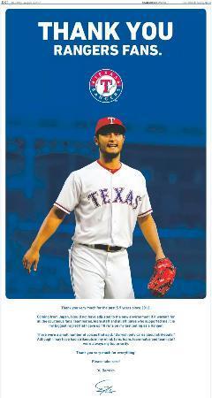 広告はレンジャーズのユニホーム姿の写真付きで掲載した。メッセージは「2012年から5年半、本当にありがとう」の一文から始まる。