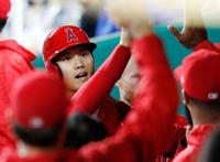 ロイヤルズ戦の8回、後続の犠飛で勝ち越しの生還をしたエンゼルス・大谷=カンザスシティー(共同)
