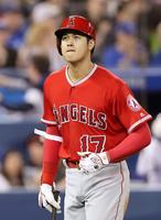 ブルージェイズ戦の7回、空振り三振に倒れたエンゼルス・大谷=トロント(共同)