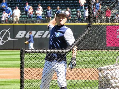 胸にチームのロゴが入った上着とユニホームのパンツ。現役時代同様、ソックスを上げたオールドスタイルでフィールドに現れたイチロー氏は一塁ベンチ前でキャッチボールを行い、肩を作った。