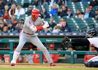 タイガース戦の1回、スイングした際にヘルメットが脱げたエンゼルス・大谷=デトロイト(共同)