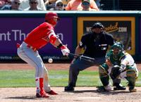 アスレチックス戦の1回、プエロの適時打で生還し、三走ラステラ(左)に迎えられるエンゼルス二走の大谷=オークランド(共同)