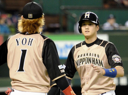 日本ハムの大谷翔平投手が初の5番(指名打者)でスタメン出場。2打席目の四回1死二塁から中越えの先制適時二塁打を放った。