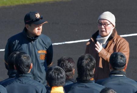 午前10時前にグラウンドに姿を見せると、客席からは拍手と歓声が飛んだ。原監督から出迎えを受けた後、選手が集合。円陣の中心で「これからが勝負だ。足腰を鍛え、けがをしないようにやってほしい。オッケー!」とゲキを飛ばした。