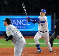 1回DeNA二死三塁、筒香嘉智は右越えに先制2ランを放ち、中畑清監督(左から2人目)に祝福される=横浜スタジアム(撮影・西岡正)