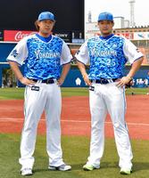 スペシャルユニフォームに身を包み笑顔を見せるDeNA・筒香嘉智(右)と山口俊=横浜スタジアム(撮影・吉澤敬太)