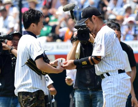 恒例の「プロポーズ始球式」が行われた。 2011年から毎年実施している“公開サプライズ・プロポーズ”。この日は、ともにロッテファンで学生時代に同球場でアルバイトをしていたという花島工真さん(25)が、彼女の舘石彩さん(25)を前に、力いっぱいの投球を披露。打席の今江敏晃内野手(32)を空振りに斬ると、「結婚してください!」とプロポーズした。