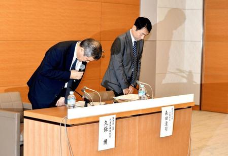 野球とばく発覚を明らかにした巨人の久保博球団社長(右は巨人の森田清司法務部長)=東京・読売新聞社(撮影・園田高夫)