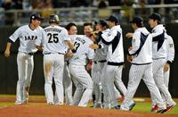 9回、中田(左)はサヨナラ打を放ち、ナインと笑顔で喜ぶ(撮影・西岡正)