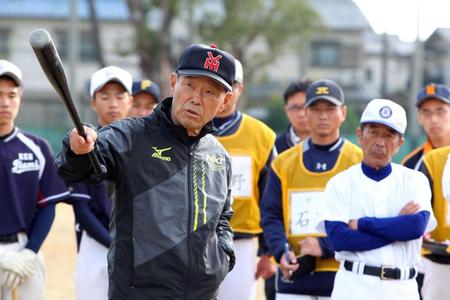 高校野球の若手指導者研修会「高校野球・甲子園塾」の実技講習が21日、兵庫県伊丹市の県伊丹高グラウンドで行われた。塾長の星稜総監督・山下智茂氏(70)と今回の特別講師、横浜前監督・渡辺元智氏(71)、拓大紅陵前監督・小枝守氏(64)の3人が県伊丹ナインを指導。全国から集まった若手指導者27人はその理論や指導方法を熱心に学んだ。