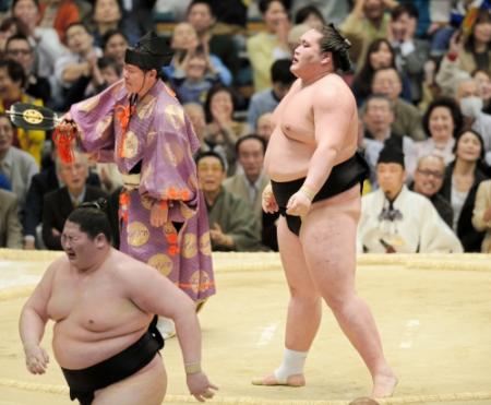 先場所は敗れたが、今回は雪辱したことにも「それどころじゃなかった。もう握力がない」と疲労困ぱい。兄弟子・日馬富士の援護次第で優勝の可能性があるが「取りあえず自分が勝たないと」と、語った。