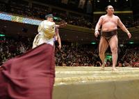逸ノ城が突き落としで白鵬を破る=両国国技館