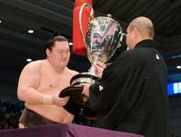 優勝者インタビューで感極まって涙を流す白鵬=エディオンアリーナ大阪(撮影・佐藤厚)