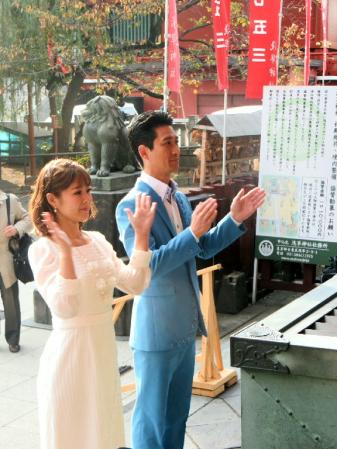 演歌歌手の三代目コロムビア・ローズ(29)と走裕介(38)が、「ローズと裕介」名義でデュエット曲「5分5秒の二人」をリリースし22日、東京・浅草神社でヒット祈願を行った。