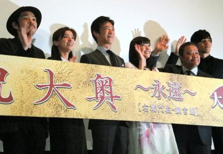 女優の菅野美穂(35)が22日、ヒロインを務めた映画「大奥~永遠~[右衛門佐・綱吉篇]」の公開初日舞台あいさつに、主演の堺雅人(39)、西田敏行(65)らと出席した。