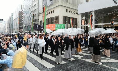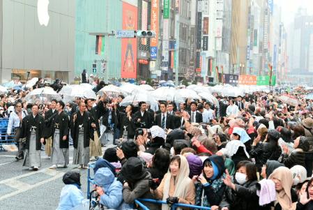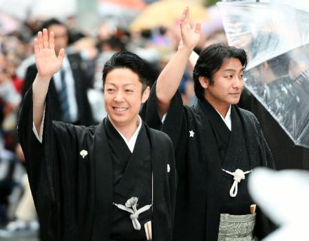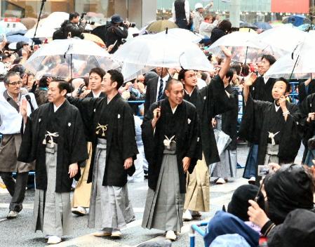 冷たい雨が降る中、傘を差さず沿道の大歓声に手を振り練り歩く(左から)市川中車、中村勘九郎、市川海老蔵、市川猿之助