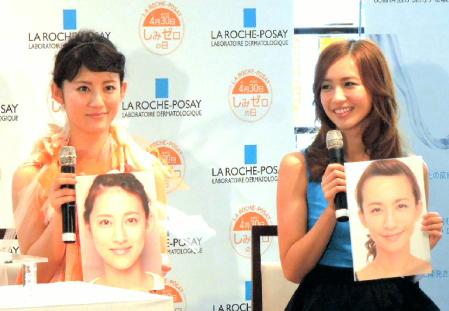 「しみゼロの日」(4月30日)を記念して、素肌が美しい女性に贈られる「Suhada Beauty Award2013」を受賞したタレント・優木まおみ(33)と福田彩乃(24)が17日、都内で行われた授賞式に出席した。