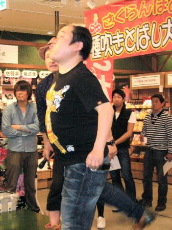 お笑い芸人、三浦マイルド(35)が18日、大阪・千日前のなんばグランド花月横の「よしもと47ご当地市場」で、イベント「さくらんぼの種吹きとばし大会」に出場した。
