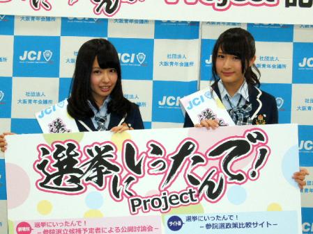 アイドルグループ、NMB48の山田菜々(21)と村上文香(20)が14日、大阪市内で、7月に実施予定の参議院選挙の啓発を目的とした「選挙にいったんで!」プロジェクトの推進リーダーに就任したことを発表した。