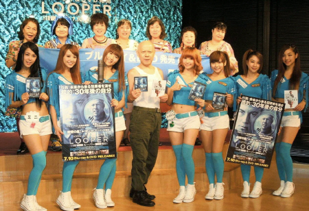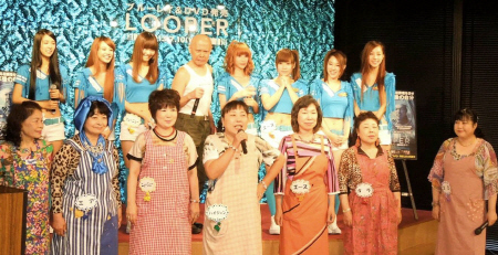 主人公ジョー(ジョセフ・ゴードン=レヴィット)が30年後の未来からやってきたジョー(ブルース・ウィリス)と対決するというストーリーに掛けて、会場にはおばちゃん7人組の「30年後ウェザーガールズ」が登場した。
