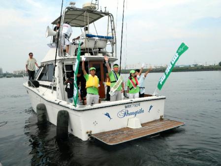 出航時には、離岸をサポートしたスタッフが誤って海に転落するという不吉な?ハプニングもあったが、佐竹本人は気合十分。酔い止めも服用せず、「船酔いには強い。“波”は荒い方が得意です」と舌もなめらかに語ると、現役時代の入場テーマ曲「怪獣大戦争マーチ」を爆音で響かせながら船を走らせ、サーファーや海水浴客に向け約4時間、海上からアピールした。