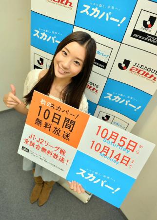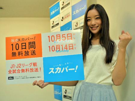 スカパーでは、10月5日から「スカパー!秋の10日間無料放送」を実施するが、それに伴い、5、6日に開催されるサッカーJ1、J2リーグを無料放送する。Jリーグ名誉女子マネで、スカパーの「Jリーグマッチデーハイライト」のMCも務める足立は「終盤になり順位も混戦で負けられない熱い戦いばかり。無料なのでぜひ一度試してみて!」と笑顔でPR。