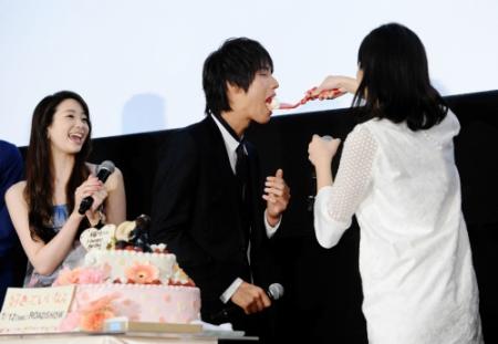 女優の川口春奈(19)が10日、都内で行われた主演映画「好きっていいなよ。」(7月12日公開)の完成披露試写会に登場し、共演の福士蒼汰(21)をサプライズのバースデーケーキで祝福した。