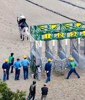 ゲート内で駐立するゴールドシップ=栗東トレセン(撮影・石湯恒介)