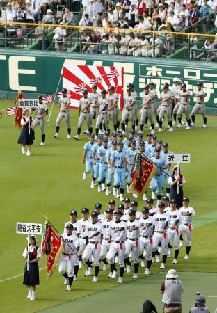 台風11号の影響で開幕が2日延期となった第96回全国高校野球選手権大会は11日、台風一過となった晴天の下、午前9時から兵庫県西宮市の甲子園球場で4万5千人の大観衆を集め、49代表校が参加して開会式が行われた。