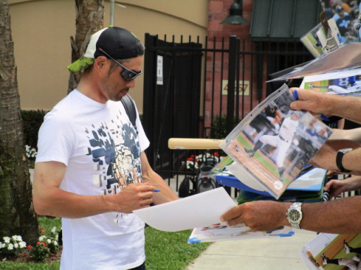練習後は日課となっている即席サイン会を実施。球団施設の外で待ち続けたファンから差し出されたボールや写真などにペンを走らせた。