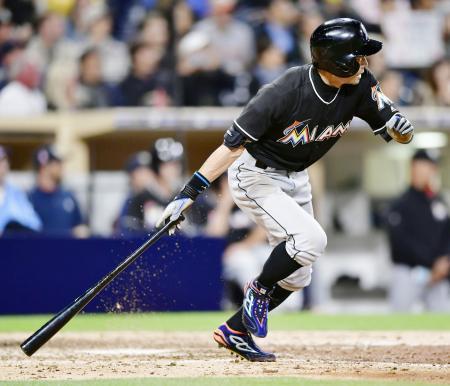 パドレス戦の8回、左翼線安打を放つマーリンズのイチロー外野手。メジャー記録の4256安打まで日米通算であと1とした=13日、サンディエゴ(共同)