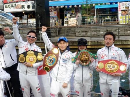 道頓堀ダイブで知られる繁華街のえびす橋付近では船を止め、「皆さんの応援のおかげで4団体制覇ができました!」と王者がマイクであいさつ。「チャンピオン、おめでとう」と道行く人々から拍手喝采を受けた。