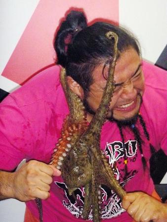 ようやくたどりついたラストは、生きたタコだった。動き回るため、食べるどころか、つかむまでに悪戦苦闘。何とか持ち上げたが、顔にはりつかれ「痛~ッ!」と絶叫した。AKIRA、熊ゴローの力を借りて足にかぶりつき、クリアしたものの、疲労困ぱいだった。