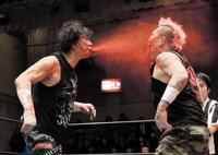 試合に勝った大仁田厚組(左から田中、大仁田、一人おいて保坂