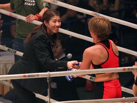 53キロ契約MMAルール5分3回戦で、プロボクサーを父に持つロシアのナタリア・デニソヴァと対戦。村田は開始早々に鋭いタックルを決めてテークダウンすると、グラウンドで主導権を握る。一時はアームロックを決めて追い詰めたが、決めきれずに1回を終えた。 2回も早々にタックルを決めてテークダウン。今度はパウンド(グラウンドでのパンチ)攻撃も見せて優位に立つ。最終の3回も抱え込んで力任せにグラウンドに持ち込み、粘る相手を仕留められなかったものの、最後まで圧倒した。 55キロ級代表の吉田沙保里らリオ五輪女子レスリング代表の面々が見守る前で完勝を収めた村田は「代表の選手に応援してもらって、とても心強かったです。今度は自分がリオオリンピックで活躍する皆さんをテレビの前で応援したいと思います」と感謝。だが、一本を奪えなかったためか「しょっぱい試合をしてすみません。こんな勝ち方するイメージじゃなかったんですけど、本当にすみません」と苦笑した。