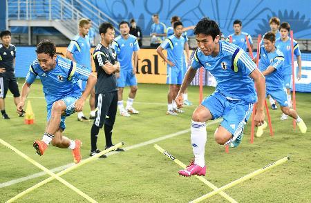 サッカーW杯ブラジル大会第2戦のギリシャ戦に向け、試合会場で調整する(手前右から)本田、岡崎、長谷部ら日本イレブン=18日、ナタル(共同)