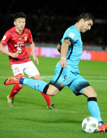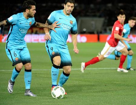 写真は、17日に行われたクラブW杯準決勝FCバルセロナ対広州恒大の前半、DFダニエウ・アウベス(32)と競り合うバルセロナのFWルイス・スアレス(28)を撮影したものだ。ゴール前で味方にボールを譲ることなく、シュートを放つスアレス。彼の積極性をよく表すプレーだった。