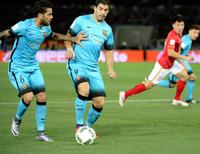 味方のダニエウ・アウヴェス(左)と競り合うバルセロナのルイス・スアレス=日産スタジアム(撮影・開出牧)