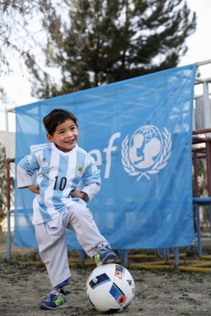 ユニセフによると、東部ガズニ州に住む5歳のムルタザ・アフマディ君は25日、サイン入りの背番号10番のユニホームを受け取った。贈られたのは、アルゼンチン代表と、メッシ選手が所属するスペイン1部リーグのクラブチーム、バルセロナのユニホームやサッカーボール。