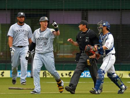 阪神の五回の攻撃で、1死からマートンに対し2ストライクからの西武・郭俊麟の4球目、143キロが左手に当たる死球に。
