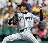 2回、DeNA ホセ・ロペスの放った打球にグラブを差し出す阪神・能見篤史=甲子園(撮影・北村雅宏)