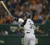 9回阪神無死、左越えに5号ソロを放つ阪神・原口=東京ドーム(撮影・飯室逸平)