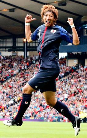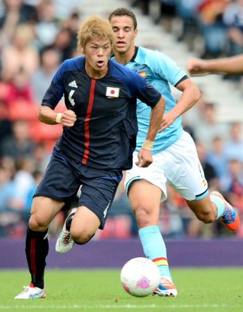 日本‐スペイン 前半、先制ゴールを決め喜ぶ大津(7)と吉田(5)。GKデヘア=ハムデンパーク(共同)