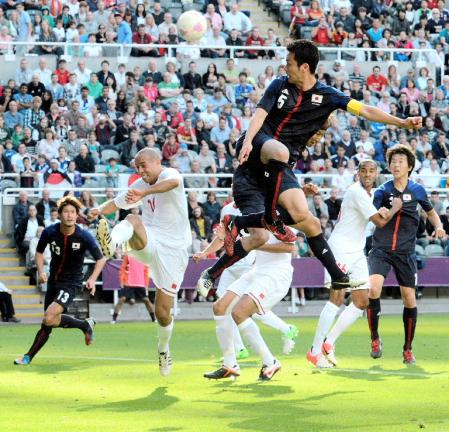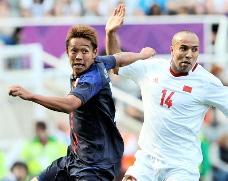 日本‐モロッコ 前半、シュートを放つ永井(左)=セントジェームズパーク(共同)