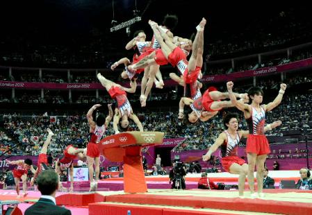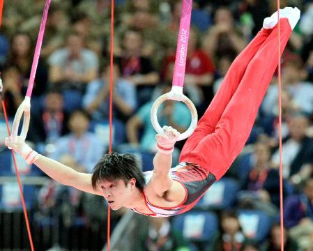 男子個人総合決勝 あん馬で着地を決める内村航平=ノースグリニッジ・アリーナ(共同)
