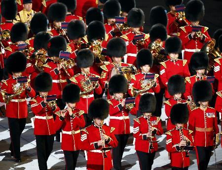 日の丸や英国旗を手に入場する日本選手ら=12日、五輪スタジアム(共同)
