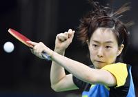 日本-ポーランド シングルスで勝利した伊藤(左)を迎える石川(右)と福原=リオデジャネイロ(共同)
