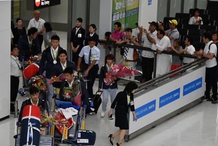 リオデジャネイロ五輪の柔道日本代表チームが15日、成田空港着の航空機で帰国。到着ロビーでは報道陣80人を含む約400人が出迎えた。