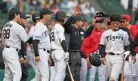 8回、死球を受けた坂本(右)と怒る藤川監督=20日