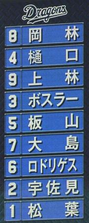 中日・井上監督はまたしても左打者をズラリと並べた。DeNA・藤浪との再戦。8月17日の対戦では投手・松葉を含めて全員左打者。今回は遊撃・ロドリゲスを除く8人が左打者。制球難のイメージを抱く右腕からの死球を警戒し、同じ右投手の石田裕が先発していた前日のスタメンから、細川、チェイビス、山本、田中、加藤を先発メンバーから外した。